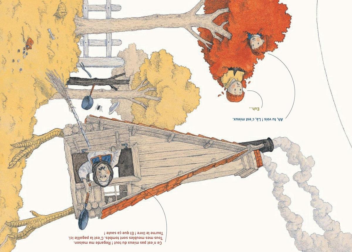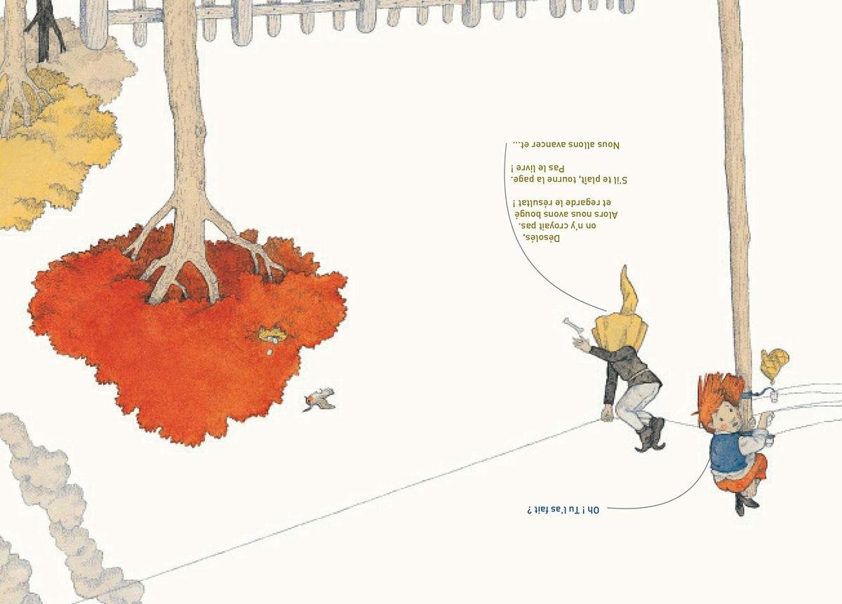 « Hé ! Lecteur ! À quoi tu joues ? Tu tiens le livre à l’envers ! Regarde-nous ! » Les personnages de contes sont sens dessus dessous. À toi de tourner, retourner, secouer le livre pour mettre de l’ordre dans ce bazar !