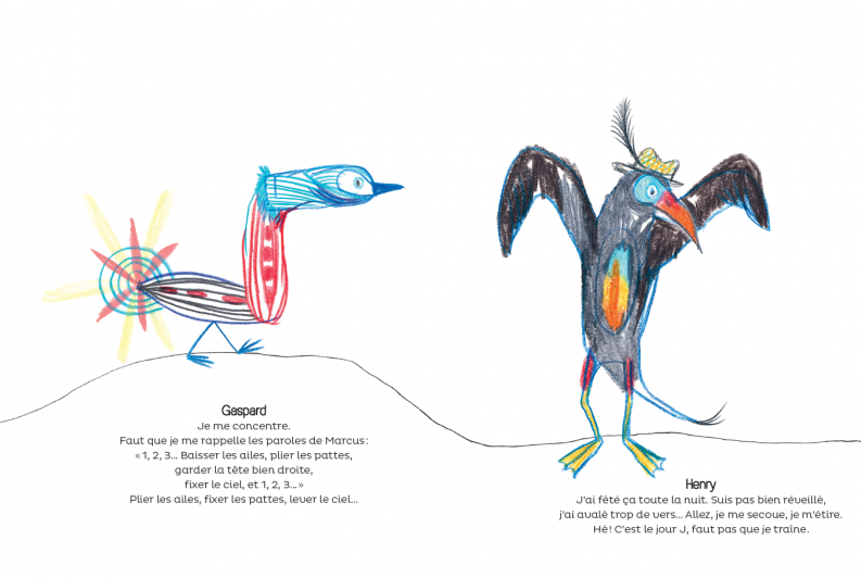 Dans le finale, éclatante ribambelle d’oiseaux imaginaires, toutes ailes déployées, chacun et chacune a trouvé sa place, sa plénitude, et a réussi à s’envoler. L’ouvrage est un ensemble de délicats dessins aux crayons de couleurs.