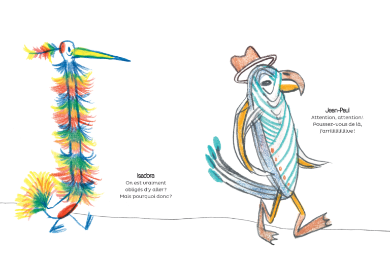 C'est le grand jour chez les oiseaux. De Achille à Zacharie, ils apparaissent un par un et livrent une courte pensée : joie, peur, impatience, manque de confiance, hésitation, distraction, concentration… Chacun dit à sa manière son émotion, son sentiment avant le grand départ.