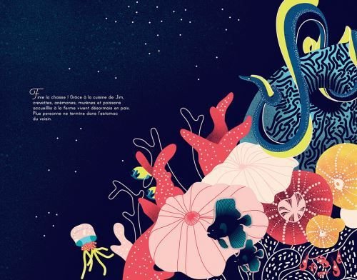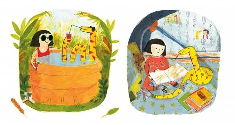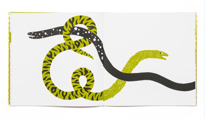 Une jolie histoire de serpents qui se tortillent, s’enlacent se transforment page après page, à coup de poils, d’épines, de plumes ou d’écailles. D’une astuce graphique, Mathilde Cochepin transforme le creux du livre en frontière invisible, les serpents y muent à chaque passage, s’habillant de plusieurs motifs à la fois, un système complexe de nœuds et de courbes qui mène crescendo à une fin… explosive !